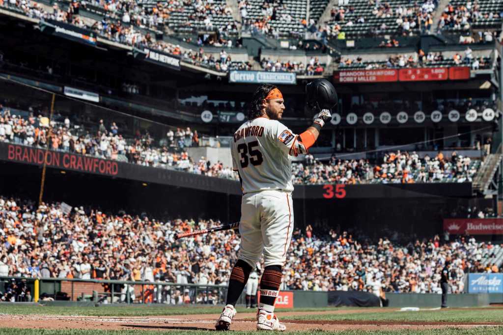 San Francisco Giants’ Brandon Crawford (35) gestures to the crowd before his at bat during the first inning of his MLB baseball game against the Los Angeles Dodgers in San Francisco, Sunday, Oct. 1, 2023.