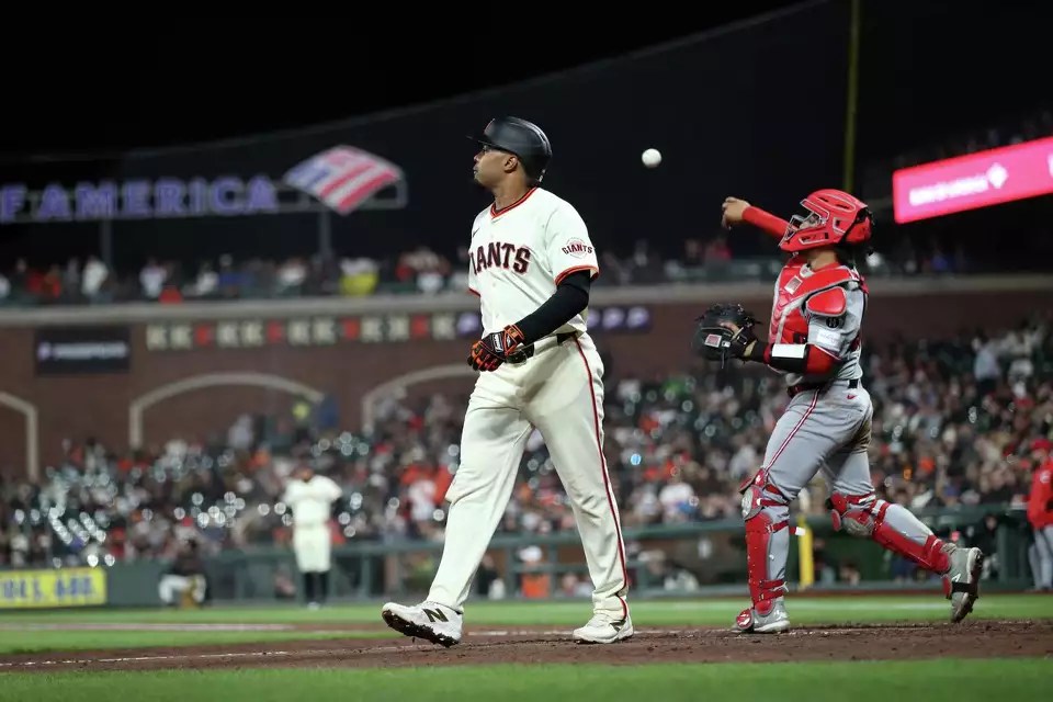 First baseman LaMonte Wade Jr. was DFA’d on June 4, 2025. He had a .352 on-base percentage in his first four seasons with the Giants, but that fell to .275 this season as the entire offense has struggled. (Scott Strazzante/S.F. Chronicle)