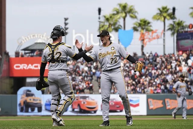The Pirates celebrate their sweep over the Giants after a 2-1 victory in 10 innings on Wednesday, July 30. Photo by AP.
