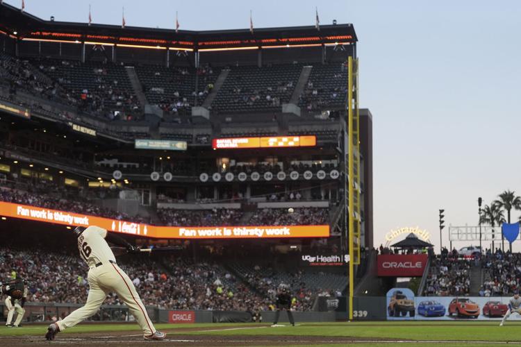 Giants rookie Patrick Bailey hits his first career home run in the second inning against Miami’s Jesus Luzardo on Sunday at Oracle Park. Scott Strazzante/The Chronicle
