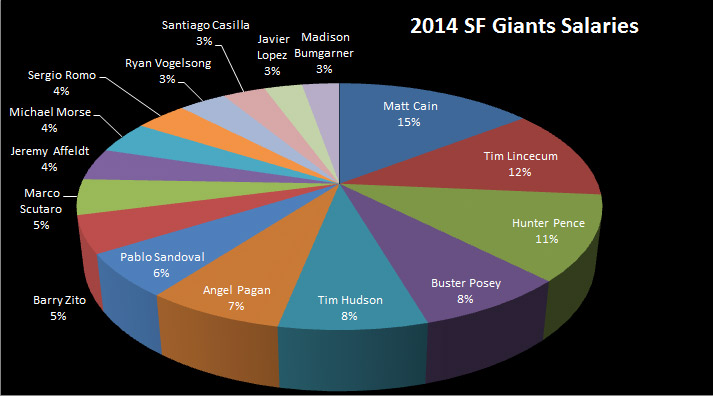 Notably, Matt Cain accounts for 15% of the budget, followed by Timmy, Hunter, and then Posey. Although we all breathed relief that Zito is off the books, his buy-out is still reflected here, at 5% of the payroll, which is more than Scutaro, Affeldt, Morse, Romo, Vogelson, Casilla, Lopez and Bumgarner (yes, MadBum has a lucrative future salary).