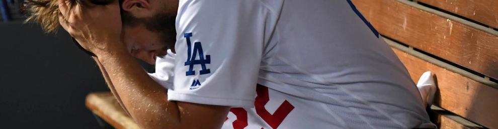 Clayton Kershaw contemplates what happened after another postseason implosion. Kershaw gave up back to back homeruns on consecutive pitches in the 8th inning, tying the game at 3. The Dodgers later lost the game 7-3 in 10 innings. (Credit:Jayne Kamin-Oncea-USA TODAY Sports)