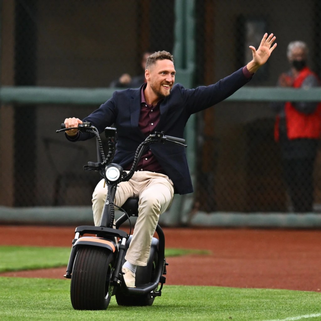 Hunter Pence became the 55th player to make the Giants’ “Wall of Fame.” Here, Hunter rides around Oracle Park on his iconic scooter before the Giants played the Dodgers on September 17, 2022. (Jose Carlos Fajardo/Bay Area News Group)