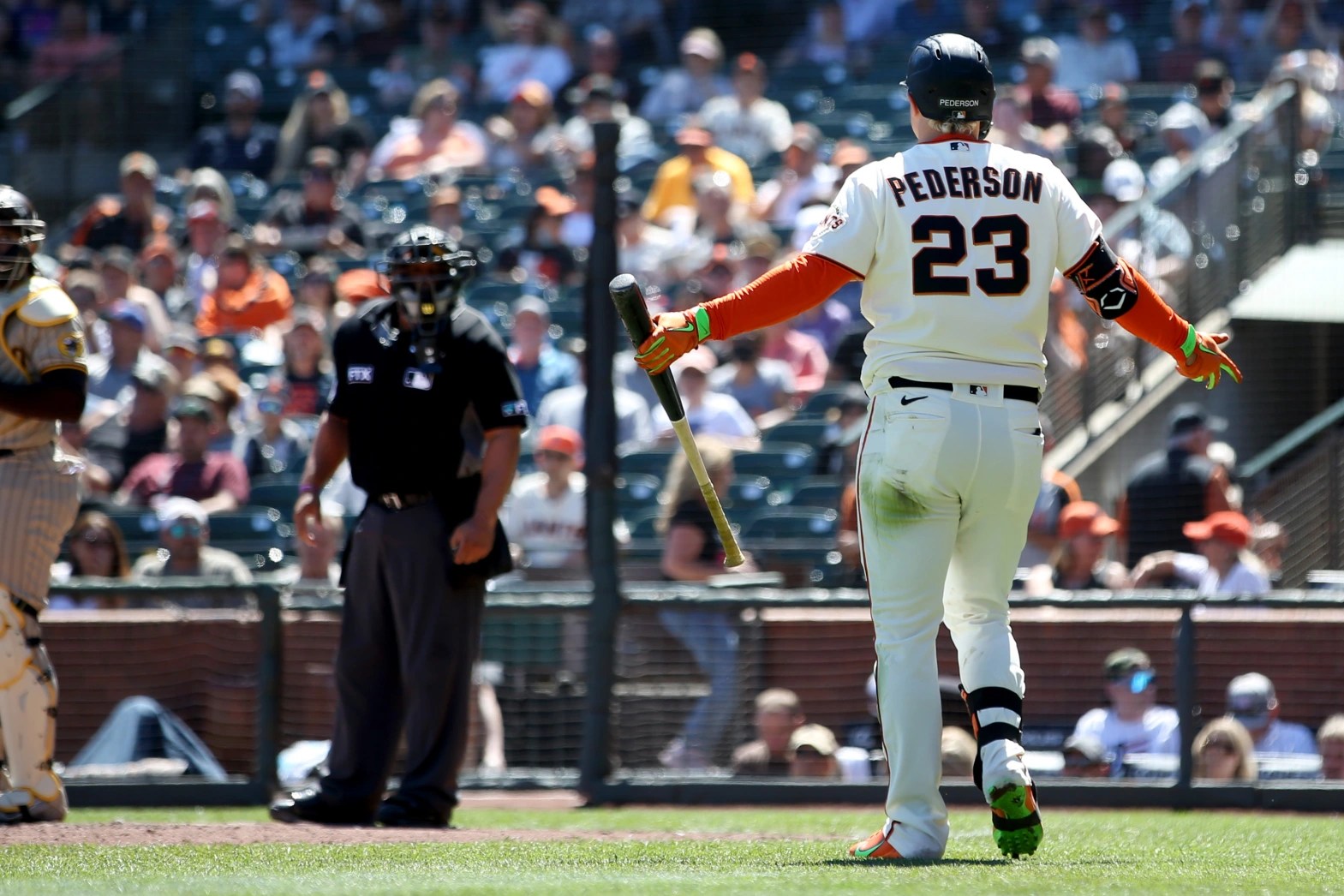 SAN FRANCISCO, CALIFORNIA – AUGUST 31: San Francisco Giants’ Joc Peterson backpedals into the dugout jawing the whole way with home plate umpire Adrian Johnson after a call strike three during an MLB game against the San Diego Padres, Wednesday, Aug. 31, 2022, in San Francisco, Calif. (Karl Mondon/Bay Area News Group)
