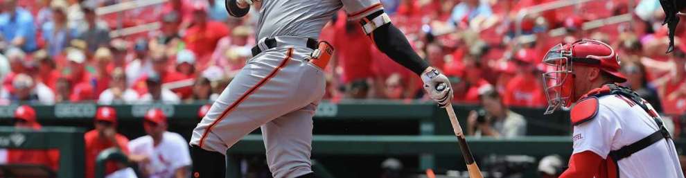 Luis Matos single in his first MLB at bat for the Giants in St. Louis. Photo by Dilip Vishwanat/Getty Images