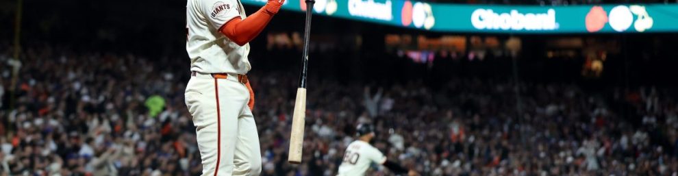Patrick Bailey admires his three run tank that secured a 3-0 win against the Dodgers on Saturday night. (photo NBC Sports)