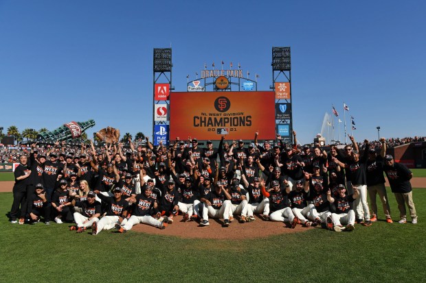 The San Francisco Giants take a team photo moments after clinching the National League West Division Title at Oracle Park on the last day of the regular season by defeating the Padres 11-4. (Jose Carlos Fajardo/Bay Area News Group)