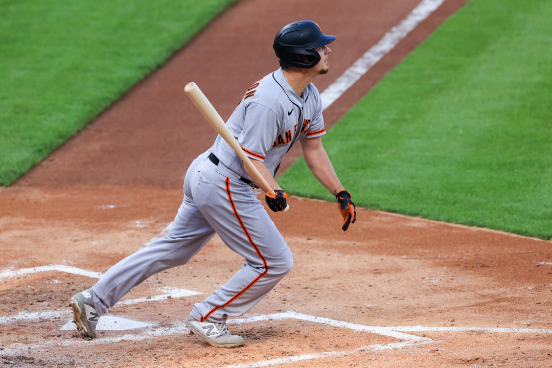 San Francisco Giants’ Alex Dickerson watches as he hits a three-run home during the fourth inning of a baseball game against the Cincinnati Reds in Cincinnati, Tuesday, May 18, 2021. (AP Photo/Aaron Doster)