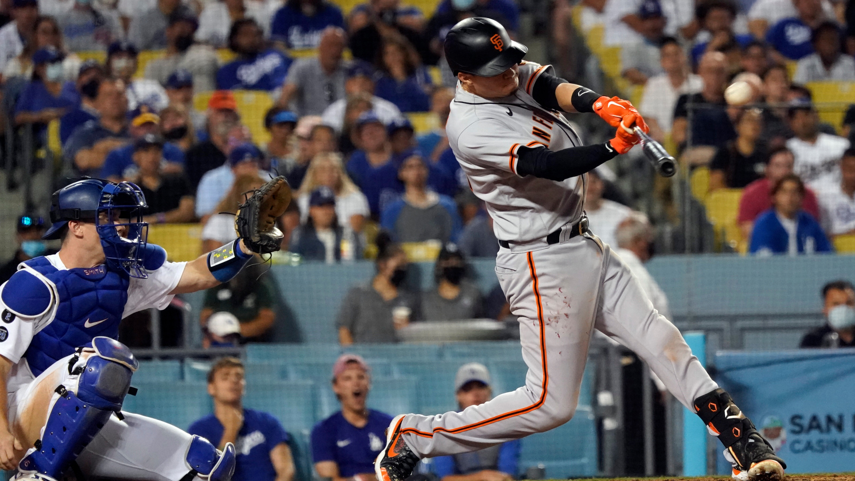 San Francisco Giants’ Wilmer Flores connects for a two-run home run during the ninth inning of the team’s baseball game against the Los Angeles Dodgers on Wednesday, July 21, 2021, in Los Angeles. (AP Photo/Marcio Jose Sanchez)